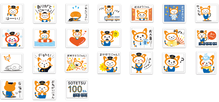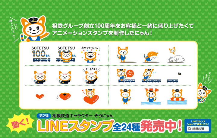 本年12月18日に相鉄グループが創立100周年を迎えることから、これまで相鉄グループを応援していただいたお客様と一緒に創立100周年をお祝いしたいという想いから制作しました。「そうにゃん」が様々な気持ちをアニメーションで可愛らしく表現しているデザインとなっており、 日常的に使用できるスタンプや創立100周年を記念したスタンプなど全24種類をLINE上でお楽しみいただけます。