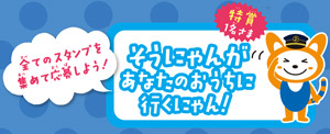 全てのスタンプを集めてスタンプ帳の専用はがきを切り取ってご応募いただくと、抽選で1名様のご自宅に「そうにゃん」がお伺いします。