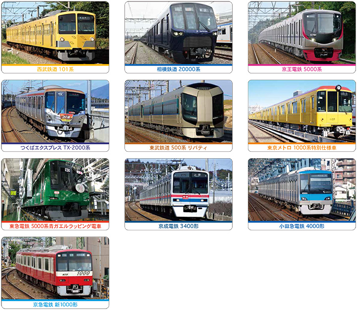 - 西武鉄道、東京急行電鉄、相模鉄道、京成電鉄、小田急電鉄、京浜急行電鉄、東武鉄道、京王電鉄、首都圏新都市鉄道(つくばエクスプレス)、東京メトロ