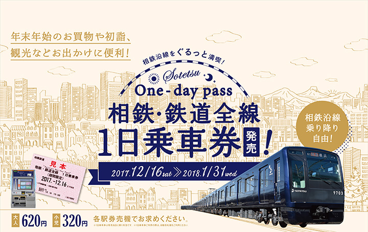 相模鉄道では平成29年12月16日(土)から平成30年1月31日(水)まで、年末年始のお出かけに便利な乗車券として「相鉄・鉄道全線 1日乗車券」[大人620円(税込)/小児320円(税込)]を発売いたします。